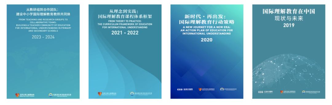 在实证研究方面,基金会联合全球化智库 (CCG) 、南南国际教育智库研究院,在国际教育领域开展了系统、深入的研究。 2016-2020 年,连续 5 年发布具有行业影响力的 《中国国际学校蓝皮书》 。 2019-2024 年,又陆续发布 4 份高质量的国际理解教育专题报告,包括:《国际理解教育在中国——现状与未来 2019 》 《新时代·再出发:国际理解教育行动策略 2020 》 《从理念到实践:国际理解教育课程体系框架 2021-2022 》 《从教研组到合作团队:建设中小学国际理解教育教师共同体 2023-2024 》。