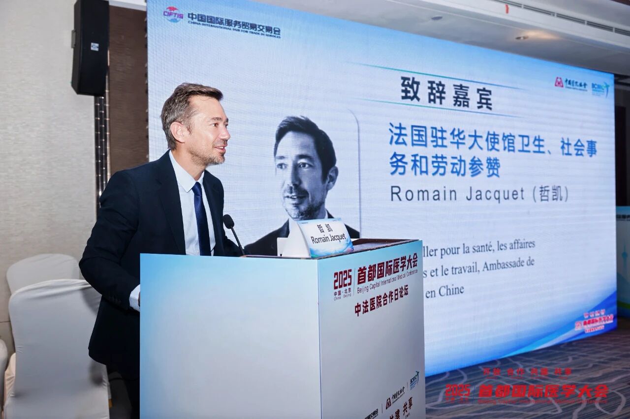 法国驻华使馆卫生、社会事务与劳动参赞 Romain Jacquet (哲凯) 表示,自 2023 年两国卫生部续签协议、 2024 年医学交流全面恢复以来,中法合作不断推进。他指出,当前中法在人工智能、数字健康、老龄化服务、医院体系等领域合作前景广阔,值得更多青年医生与企业共同参与推动。他也特别提到语言与人才问题,认为未来的中法医疗合作应更加注重多语种人才储备,强化教育体系支撑。