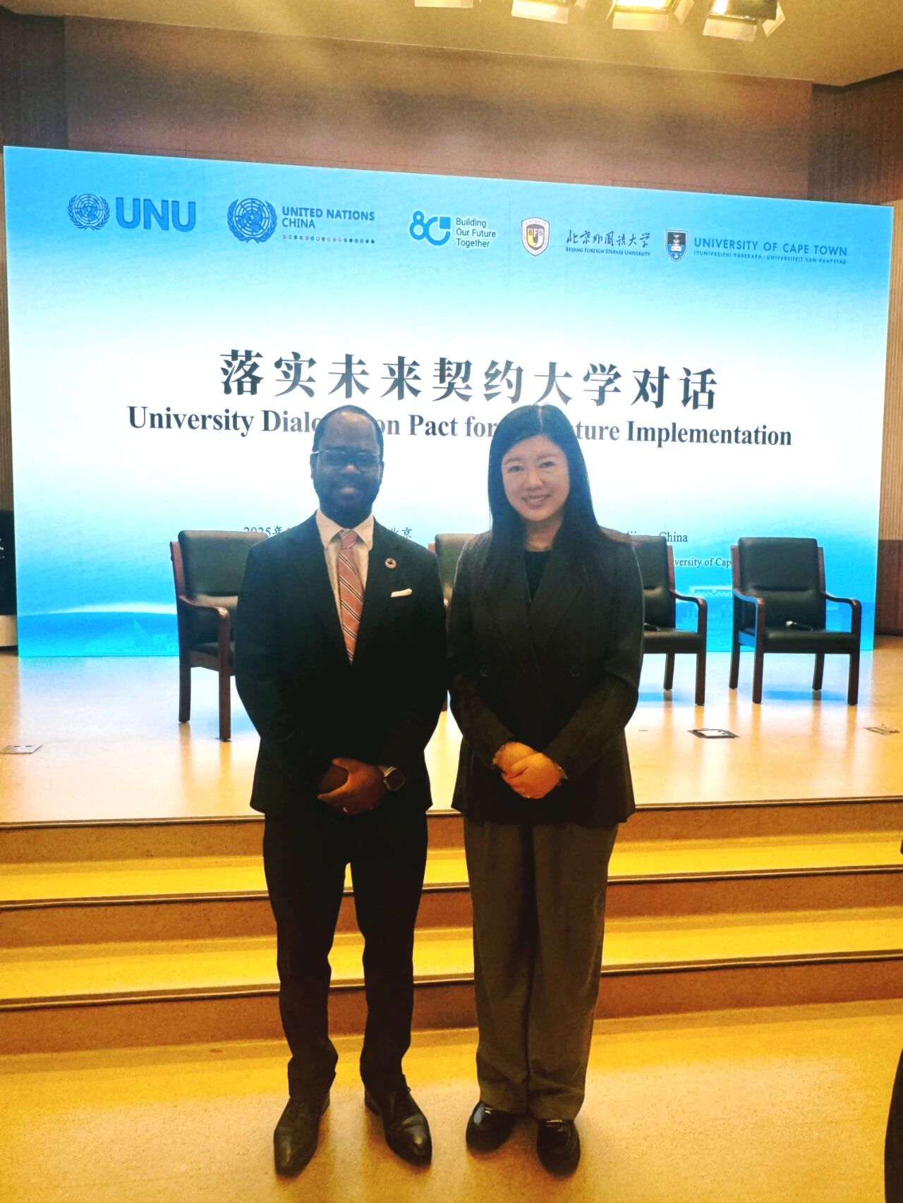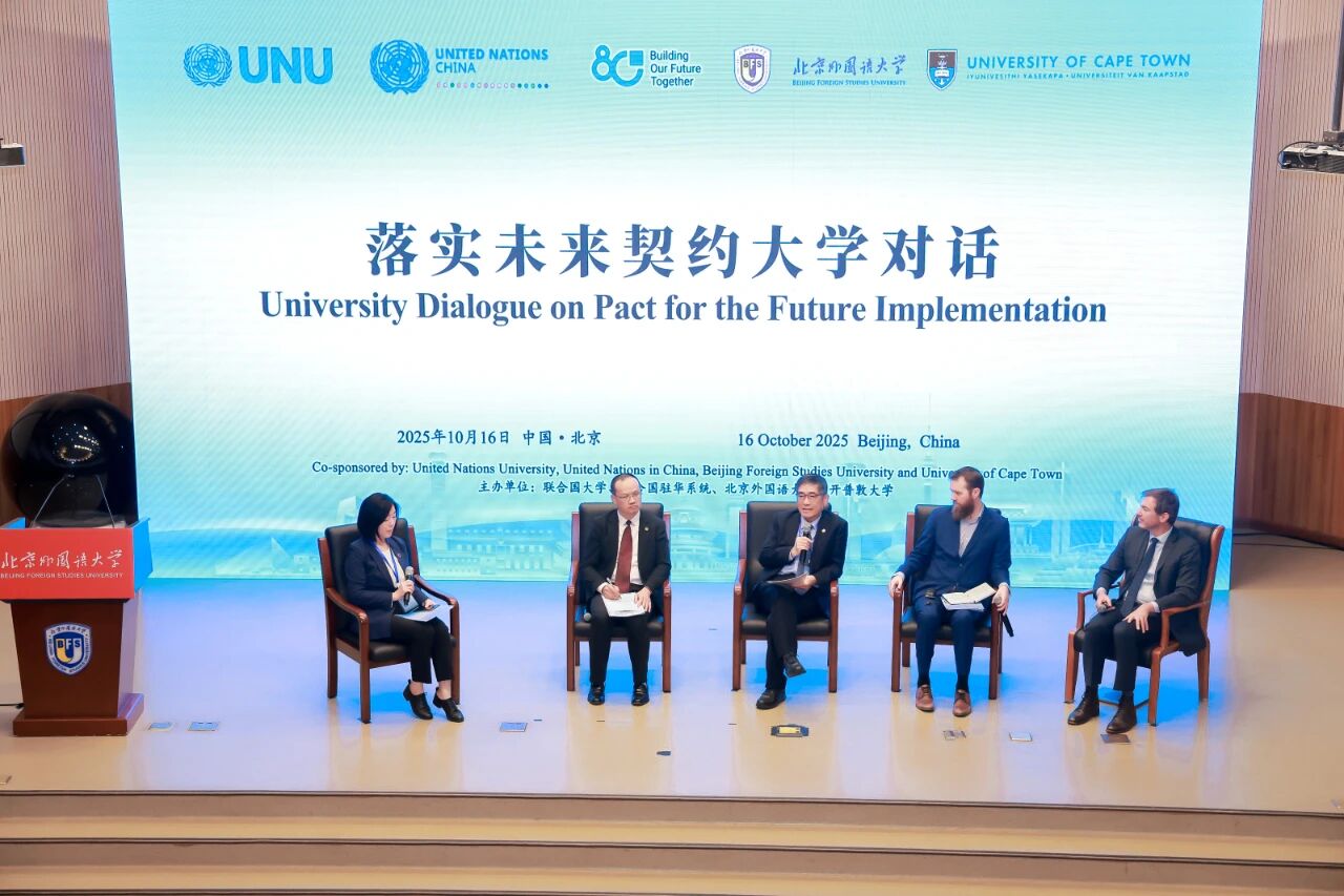 2025 年 10 月 16 日,「落实未来契约大学对话」 活动在北京外国语大学举行。作为联合国未来峰会后续机制的重要延展,本次对话由联合国大学、联合国驻华系统、南非普勒敦大学与北外联合主办,聚焦高校如何在 《未来契约》 框架下发挥全球知识共同体作用,参与可持续发展、教育公平与多边治理的协同路径探索。来自联合国系统、各国驻华机构、全球高校与青年组织的代表齐聚一堂,展开跨文化、跨区域、跨代际的深入交流。